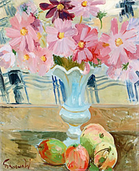 STILLEBEN MED FRUKTER OCH BLOMMOR I VAS