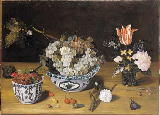 | Bowl in porcellana con tralci d’uva, tazza con more, vaso di fiori, fiori e frutta sul piano | |