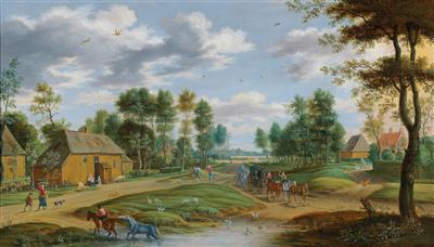 | A landscape with a horse-drawn cart and travelers on a village road | |