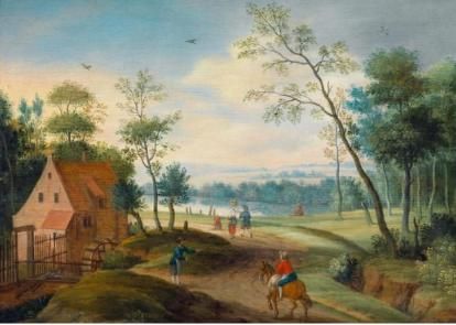 Wooded landscape with travellers by a water mill