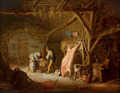 A peasant family preparing meat in a barn