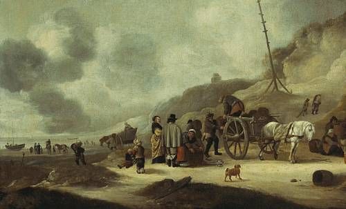 A couple watching a fishmonger loading a horsedrawn wagon on the beach