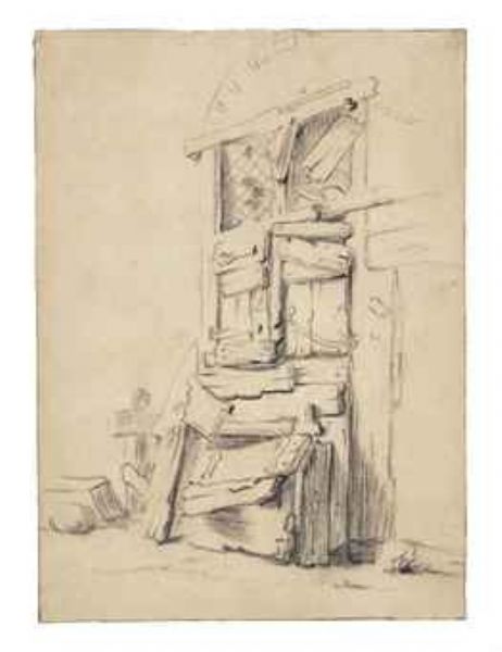 | The boarded-up door of a cottage | |