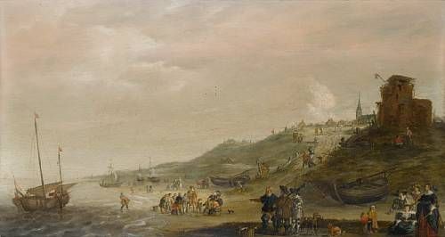 A coastal landscape with elegant figures on the shore and fishermen unloading their catch