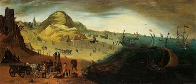 | Dutch coastal landscape with fishmongers, horse-drawn waggons and numerous ships | |