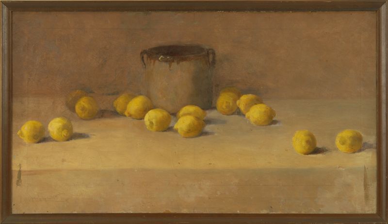 Still life with stoneware crock and lemons.