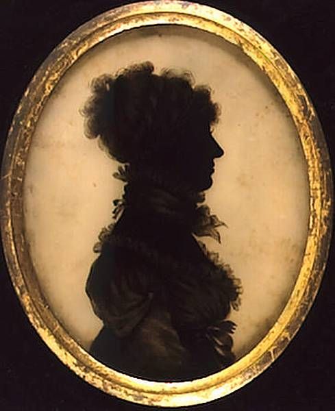 | A silhouette of a Lady, profile to the right, wearing dress with lace trim, ruff and scarf about her neck and strings of pearls | |