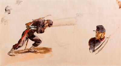 Soldats poussant un canon et esquisse
