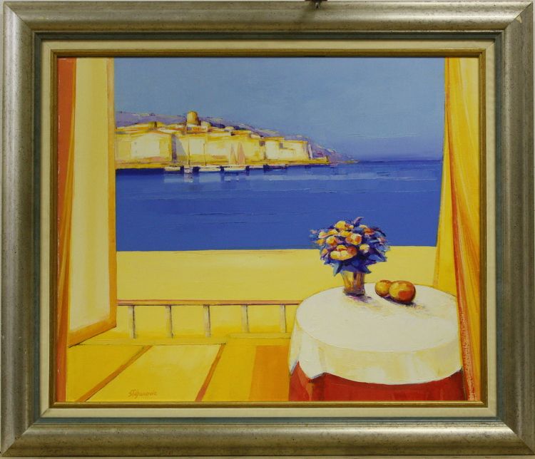 Stilleven met bloemen en fruit op tafel met zicht op het water (gezicht op Dubrovnik)