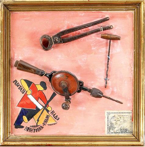 Assemblage aus drei Werkzeugen auf bemalter Hartfaserplatte,