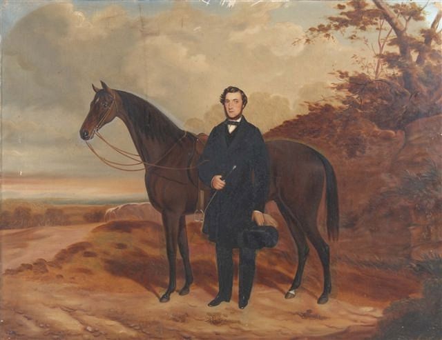 Portrait of a gentleman beside his horse and holding his top hat in a country scene