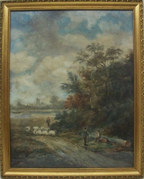 | A shepherd on a path with his flock and a river in the background | |
