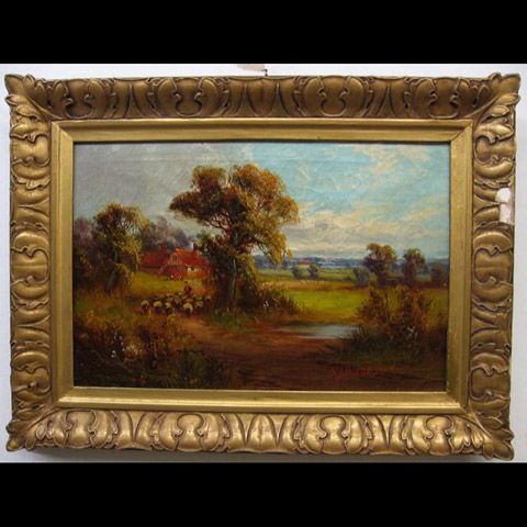 SHEPHERD AND FLOCK OUTSIDE OF COTTAGE