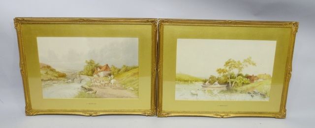 Two figures, boy and girl, in a rowing boat with swans in the river and thatch cottage beyond, and COMPANION