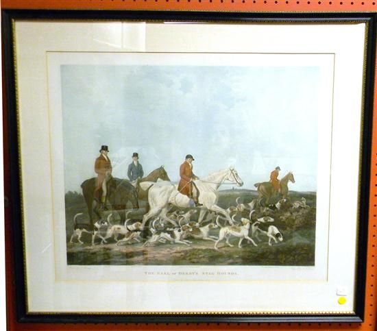 | The Earl of Derby's Stag Hounds's print, matted and framed under glass, minor wear to frame | |