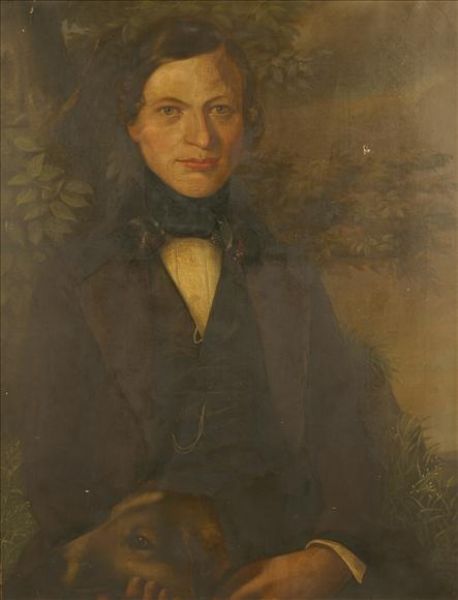 | Portrait Of a Gentleman, half length, seated in a landscape, his dog resting its head on his knee | |