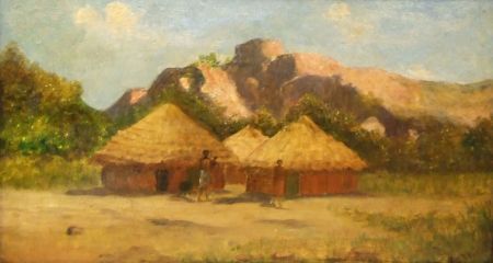 Study of South African Landscape with Tribal Settlement and Mountains Beyond