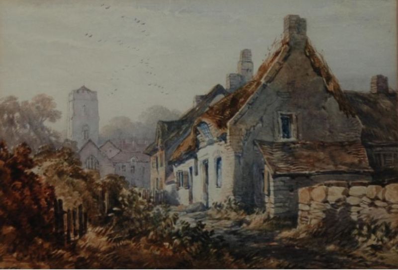 Village scene with cottages and church in background