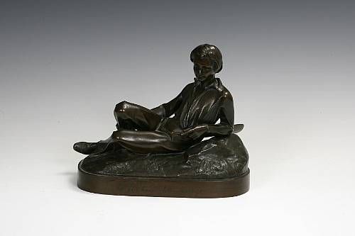 a young man reclining on a naturalistic base, with a cricket bat under his arm