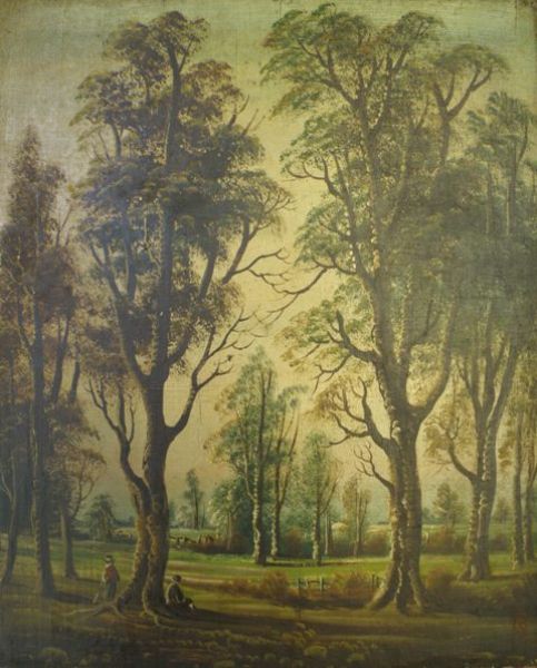 At Snitterfield, two figures resting beneath mature trees in full leaf, fields and other trees beyond
