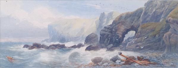 A fishing boat in a cove; Wreakage on a rocky coast