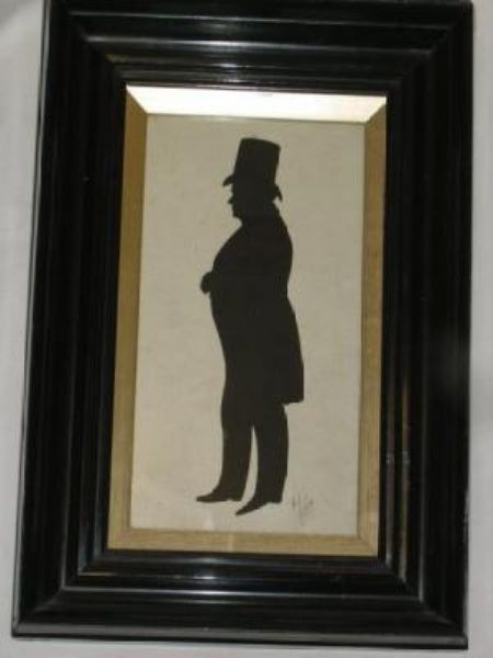 Silhouette portrait of gentleman, full length in top hat, profile to the left