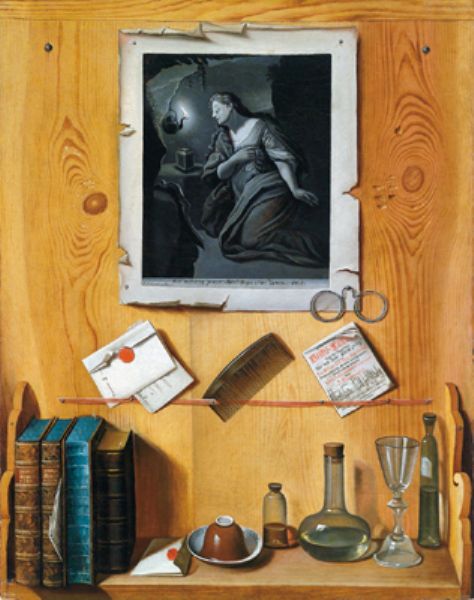 | Trompe l’oeil of a wooden pin board and a shelf, the pin board with an aquatint etching depicting Mary Magdalene | |