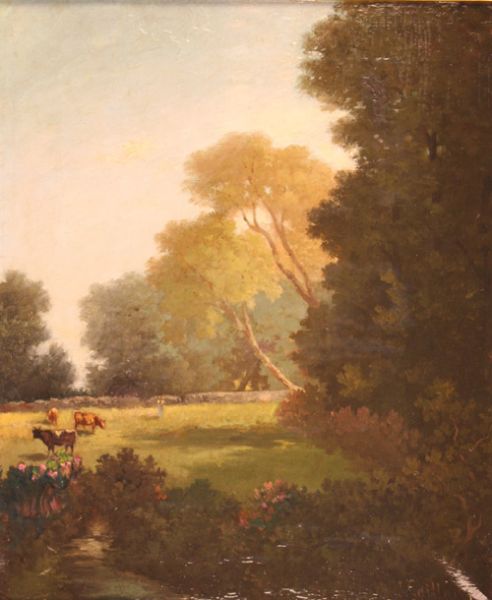 Cattle grazing in a Walled Meadow near a Pool of Water