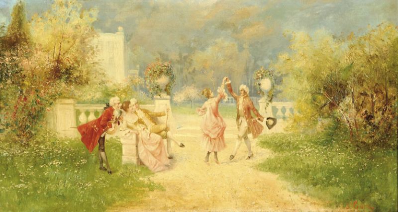Een elegant muciserend en dansend gezelschap in een kasteeltuin
