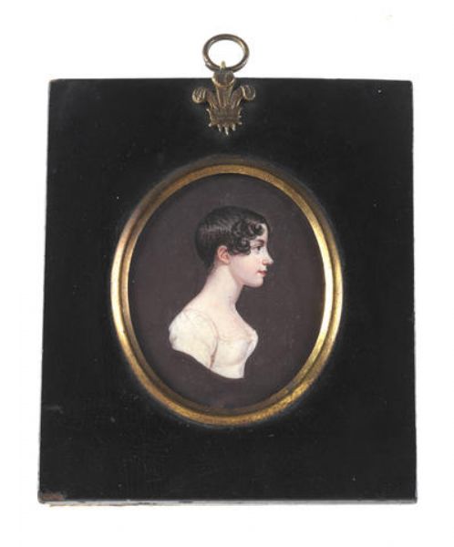 A bust-length profile of a Young Lady, wearing white dress, her dark hair cropped short.