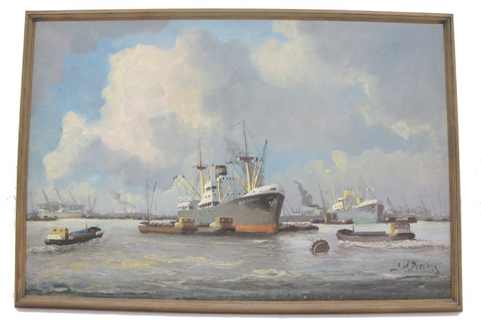 Harbor scene with cargo ships, tugs and skyline of cranes on docks