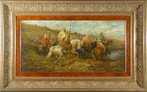 Gruppe von berittenen Arabern in prächtigen Gewändern, die durch die Steppe reiten