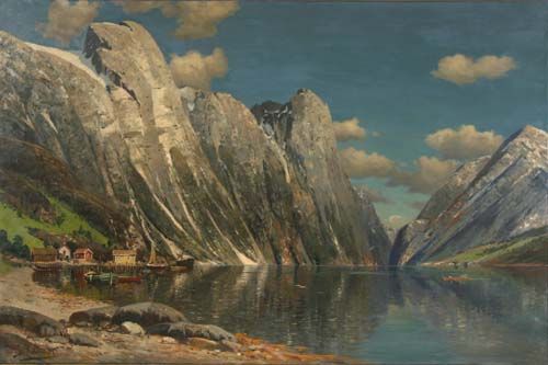 Fjordlandschaft mit Häusern, Schiffen und Booten