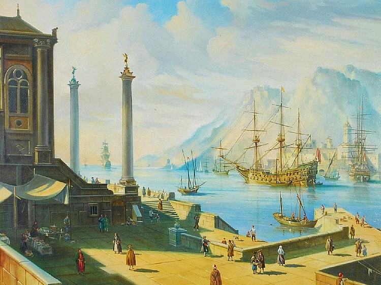 | A seventeenth century style pastiche of a Mediterranean port with shipping | |