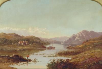 | Lakescene with Cottage and Fisherman in the Foreground and Mountains Beyond | |