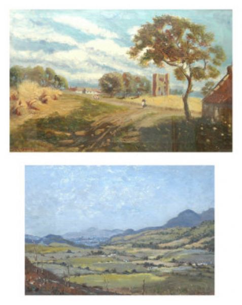 Figures on a country road before a ruined castle, Signed oil on canvas 30x46cm