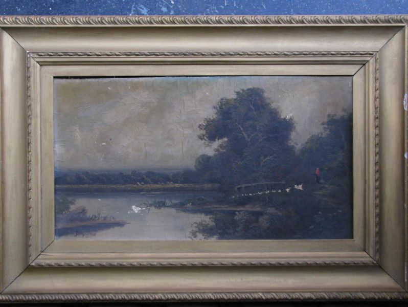 depicting river landscape with figure walking on wooded path, having haystacks and church in background