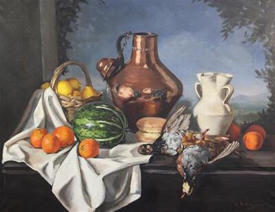 Still life of partridges, vegetables and fruit, a landscape beyond