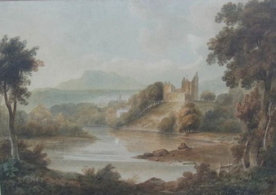 A view of Doune Castle, in the county of Perthshire, with the city of Barr beyond