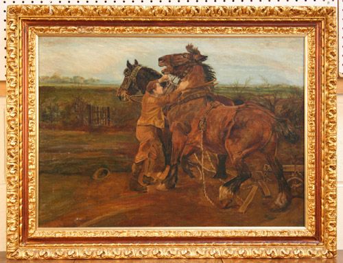 Groom preparing Two Shire Horses within a Landscape