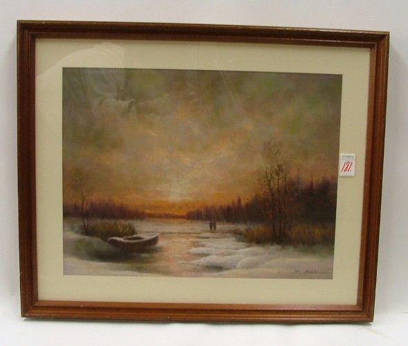 | Winter landscape at sunset with figures on frozen lake, row boat nearby. | |