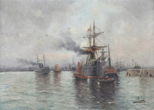 Harbour view with twomaster and steamer, towing boats and sloops near the stockade