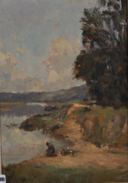Figure with cart at a riverside