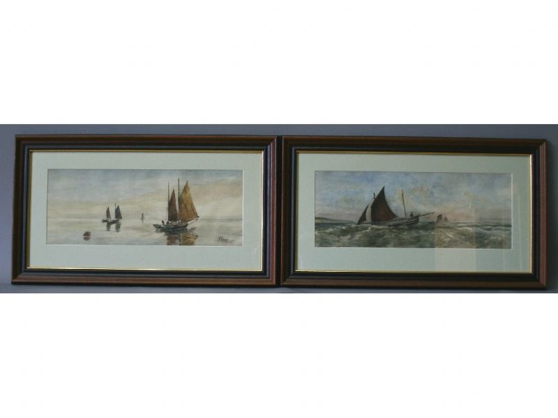 fishermen and boats in full sail, one on calm water, the other on choppy sea