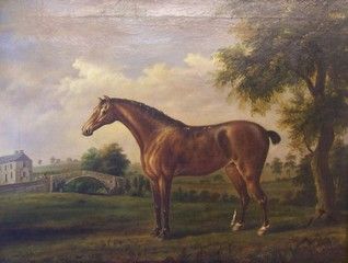 a Bay Hunter in a field with a country house and figures looking over a stone bridge