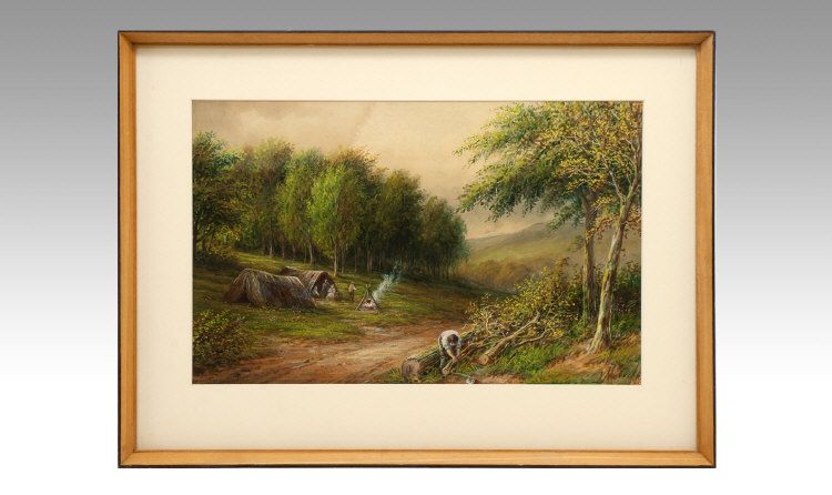 A Family Resting In Tents In A Field With A Pot Boiling Over A Fire