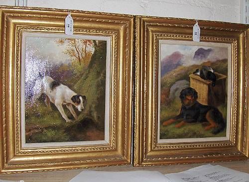A terrier by a rabbit hole, and a setter guarding the day's bag,