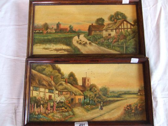 Village scene with man shepherding sheep by pond and figures by cottages