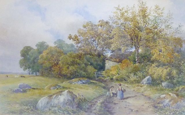 Two figures on a stone path, cattle in the field beyond and trees in summer leaf