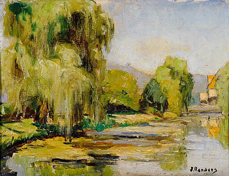 Weiden am Bachlauf, im Hintergrund Gehöft